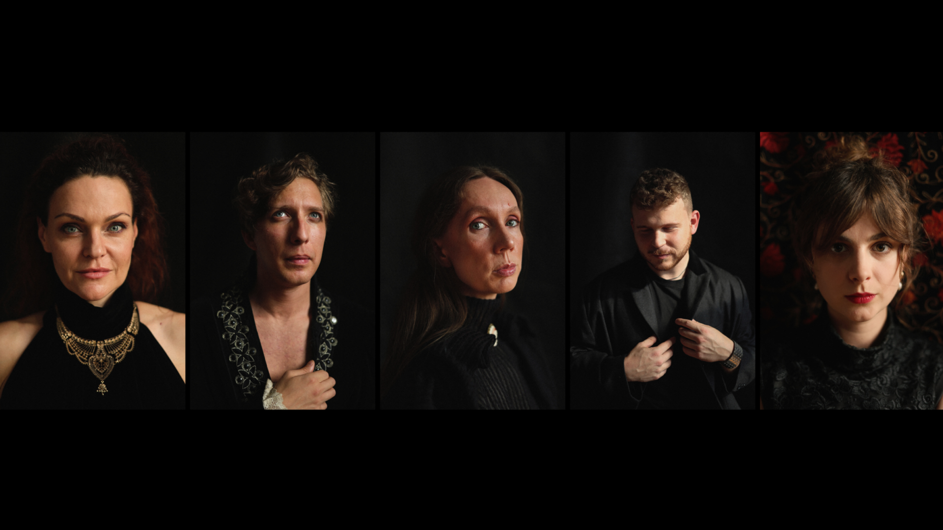 Na czarnym tle cztery postacie w czarnych ubraniach.