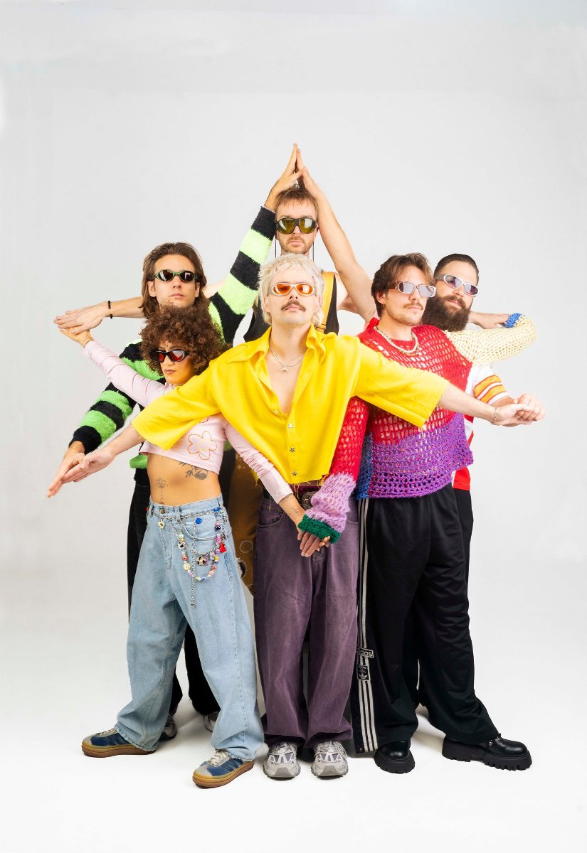Sześcioosobowy zespół ubrany w kolorowe, eklektyczne stroje z lat 90. i okulary przeciwsłoneczne, ustawiony w symetrycznej pozie przypominającej totem lub rozłożone skrzydła na białym tle.