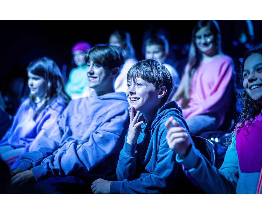 Na zdjęciu nastolatki siedzące w kinie, patrzą na ekran, śmieją się.
