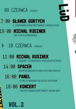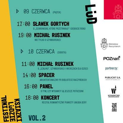 Druga edycja Festiwalu Ludzie Książki to okazja do spotkania z autorami, wydawcami i lepszego poznania świata książki. W roku Wisławy Szymborskiej dwa razy spotkamy się z Michałem Rusinkiem, by porozmawiać o noblistce, ale także o słowach i o tym, co szalik ma wspólnego z poezją. Zapytamy też czytelników o ulubiony wiersz poetki. Gościć będziemy Sławka Gortycha, autora kryminałów, który szturmem wdarł się na rynek książki. Spotkamy się z wydawcami, zwiedzimy Bibliotekę i posłuchamy muzyki, która bywa ilustracją dzieł literackich, a także stale inspiruje twórców.