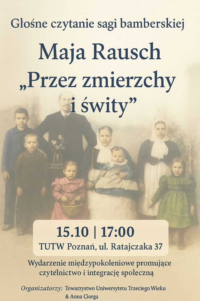 Głośne czytanie odbędzie się 15 października, godz. 17.00 w siedzibie TUTW, ul Ratajczaka 37 (I piętro). Spotkanie poświęcone będzie czytaniu fragmentów sagi bamberskiej pt. Przez zmierzchy i świty autorstwa Mai Rausch. Jest to pełna ciepła, historii i wspomnień książka o poznańskich Bambrach, którzy w XVIII wieku przybyli do Poznania i jego okolic.