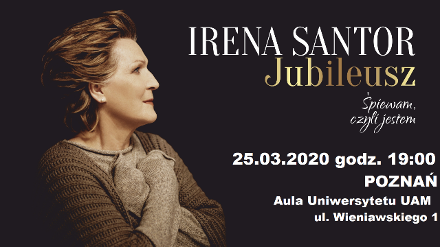 "Koncert Ireny Santor w Auli Uniwersyteckiej UAM Poznań, który pierwotnie miał się odbyć w dniu 25 marca, a został przeniesiony na 29 czerwca ma nowy termin 16.09.2020 (środa) godz. 19:00.