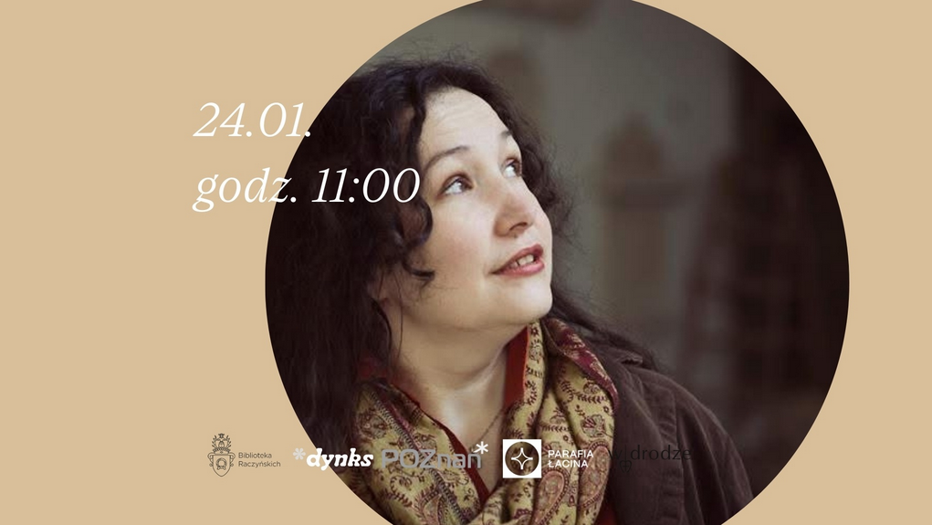 Portret kobiety z ciemnymi kręconymi włosami, patrzącej w górę, na jasnym tle. Wokół informacje o wydarzeniu zawarte w treści artykułu oraz loga organizatorów. Pobierz baner (PNG, 470,09 kB)
