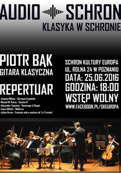 Pierwszym artystą, który wystąpi w Schronie Kultury Europa, będzie Piotr Bąk. Jest to gitarzysta klasyczny, absolwent klasy prof. Piotra Zaleskiego w poznańskiej Akademii Muzycznej im. I. J. Paderewskiego. Stypendysta Funduszu Grupy Wyszehradzkiej, półfinalista i finalista międzynarodowych konkursów gitarowych w Hiszpanii, Czechach, Liechtensteinie i Wiedniu. Występował na terenie całej Polski, solo oraz w projektach kameralnych z pianistą Wojciechem Świętońskim. Obecnie - student studiów podyplomowych prowadzonych w praskiej Akademii Sztuk Scenicznych przez maestro Pavla Steidla. Interesuje się nie tylko muzyką współczesną, ale również praktyką instrumentalną dawnych epok, dawnym instrumentarium i zagadnieniami z zakresu lutnictwa. Oprócz działalności koncertowej, Piotr Bąk publikuje na łamach magazynu gitary klasycznej "Sześć Strun Świata". W wolnym czasie rozwija pasje związane z historią i trenuje szermierkę.
