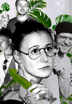 Kobieta i trzech mężczyzn, trzymają zielone liście.