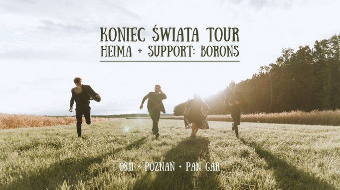 Heima wyrusza w trasę promującą EP-kę "Koniec świata". Zespół z Łodzi zaprezentuje nowy materiał utrzymany w stylistyce art popu i soft rocka, znany z ciekawego brzmienia i szczerych tekstów. Jako support wystąpi Borons - wokalistka i producentka tworząca alternatywny pop z elektronicznymi akcentami.