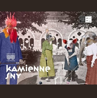 Czarno-biała fotografia Dziedzińca Różanego z czasów cesarskich. Półokrągłe okna z kolumienkami, roślinność. Na pierwszym planie cztery postacie w strojach z epoki, jeden mężczyzna, trzy kobiety. Grają w krokieta. Ich ubrania zostały pokolorowane, głowy natomiast zastąpiono łbami zwierząt: koguta, królika, świni i słonia. W prawym górnym rogu grafiki zamieszczona jest sygnatura Centrum Kultury Zamek, w lewym, dolnym napis: "kamienne sny' oraz logo teatru Usta Usta Republika. Pobierz baner (JPEG, 52,42 kB)