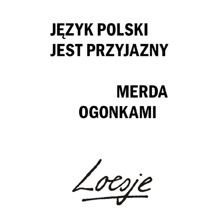 Na białym tle grafiki widnieje duży napis: Język polski jest przyjazny. Merda ogonkami. Poniżej logo Loesje.