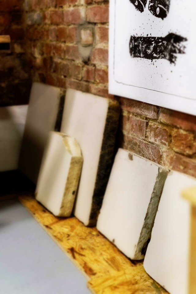 Zdjęcie przedstawia ułożone obok siebie kamienie litograficzne, służące za matryce wykorzystywane w druku litograficznym.