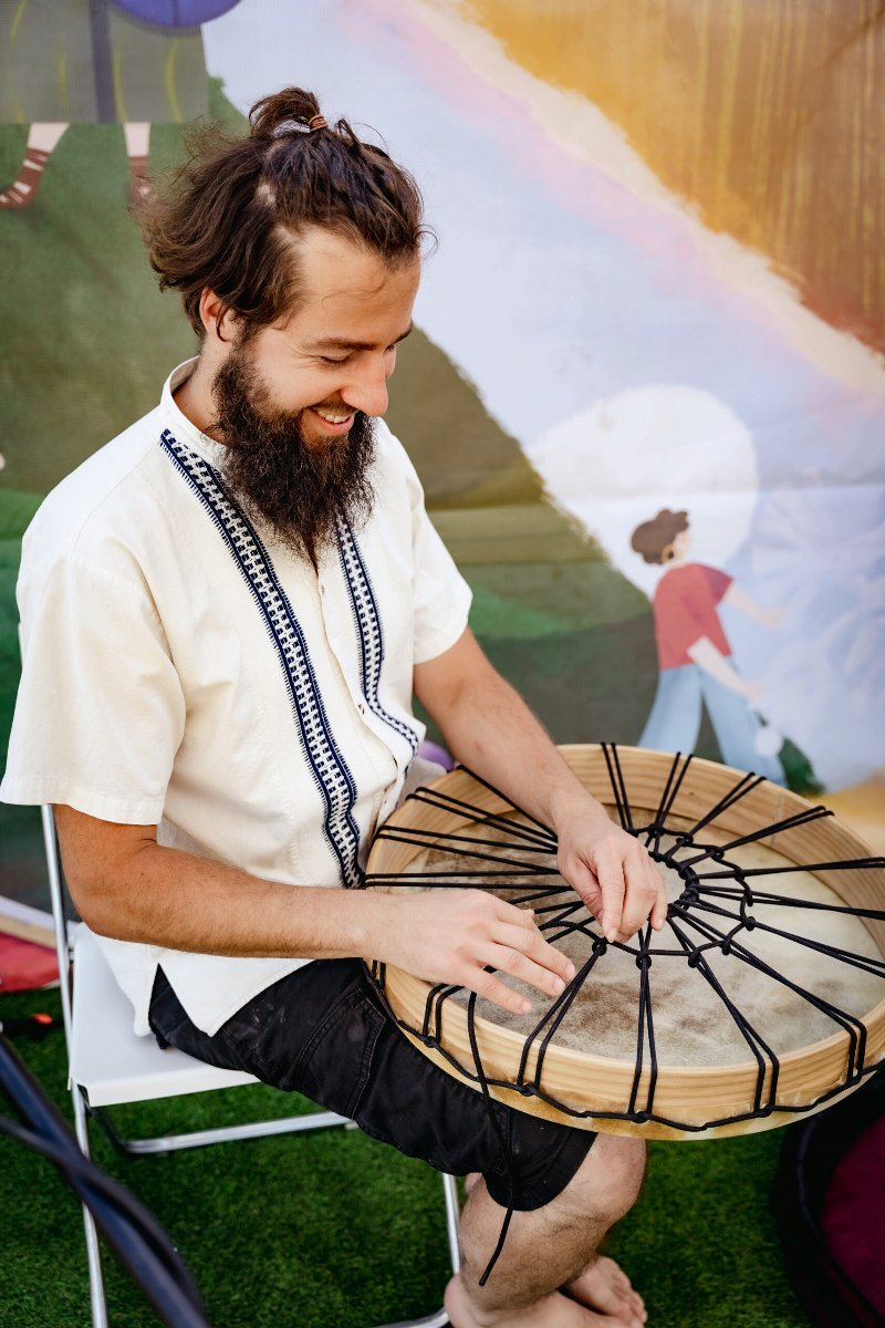 Opowiadają i grają na instrumentach (djembe, kalimba, tank drum, drumla): Szymon Góralczyk i Wojtek Tatarynowicz