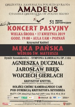 Już w Wielką Środę, 17 kwietnia zapraszamy Państwa na niezwykły koncert. Orkiestra pod batutą Agnieszki Duczmal wykona utwór Krzysztofa Knittla Męka Pańska według Św. Mateusza oraz Symfonię kameralną Dymitra Szostakowicza. Solistami podczas tego koncertu będą: Jarosław Bręk (bas-baryton), Wojciech Gierlach (bas), Krzysztof Knittel (instrumenty elektroniczne) oraz Soliści Chóru Kameralnego UAM pod dyrekcją Krzysztofa Szydzisza.