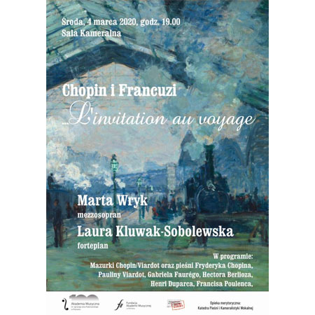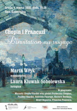 Wszyscy pamiętamy, co Norwid pisał o Chopinie: "rodem Warszawianin, sercem Polak, a talentem świata obywatel". Rzadko jednak myślimy o tym, jak twórczość tego obywatela świata wpływała na kolejne pokolenia kompozytorów, zwłaszcza we Francji, która stała się dla Chopina drugim domem. Czyż w niezwykle nastrojowych, wysublimowanych harmonicznie pieśniach Faurégo, Duparca czy Poulenca nie pobrzmiewają echa chopinowskich "nocnych pieśni" czyli nokturnów? W koncercie Chopin i Francuzi... L'invitation au voyage łącznikiem pomiędzy pieśniami Chopina i jego francuskich następców stanie się postać Pauliny Viardot - uczennicy Chopina, która wspólnie z kompozytorem zaaranżowała jego mazurki na pieśni, łączące chopinowską melancholię i wokalną brawurę...