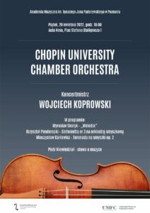 CHOPIN University Chamber Orchestra - zespół powstał w 2017 roku z inicjatywy rektora UMFC prof. Klaudiusza Barana oraz ówczesnego inspektora orkiestry Aleksandra Zwierza - obecnego managera. Kierownictwo artystyczne nad formacją zostało powierzone dyrygentowi Rafałowi Janiakowi. Powołaniu orkiestry przyświecała idea starannej selekcji muzyków tak, by zespół mógł prezentować bardzo różnorodny, często odkrywczy program, nie tylko w murach warszawskiej uczelni muzycznej, ale także na zewnątrz, promując tym samym wysoki poziom artystyczny UMFC. Członkami orkiestry są wybitni studenci, wybrani w trybie wieloetapowych przesłuchań. Trzon zespołu stanowią instrumenty smyczkowe, lecz - w zależności od potrzeb - zespół współpracuje z niemal każdym wyróżniającym się instrumentalistą związanym z UMFC. Sposób funkcjonowania zespołu jest nowością spośród podobnych formacji działających na uczelniach artystycznych, co przekłada się na wysoki poziom artystyczny orkiestry, nadając wyjątkowej wartości wydarzeniom muzycznym z jej udziałem. Pomimo krótkiej działalności, zespół może pochwalić się licznymi sukcesami. Od niemal początku istnienia orkiestra współpracuje z kancelarią Prezydenta RP, uświetniając swoją grą ważne wydarzenia z udziałem Prezydenta Andrzeja Dudy i najważniejszych osobistości kultury w Polsce, występując kilkakrotnie w Pałacu Prezydenckim m.in. z okazji 200. rocznicy śmierci Tadeusza Kościuszki, podczas koncertu "Narodowe Granie" w 200. rocznicę urodzin Stanisława Moniuszki, ale także w Pałacu Narodów ONZ w Genewie z okazji 100-lecia odzyskania przez Polskę Niepodległości, tym samym współpracując z wybitnymi dyrygentami, m.in. Grzegorzem Nowakiem czy Marcinem NałęczemNiesiołowskim.