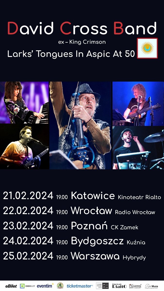DAVID CROSS, angielski skrzypek, klawiszowiec, kompozytor, wykładowca London Metropolitan University. Znany jako muzyk super grupy King Crimson, z którą współpracował w latach 1972-1974. Pozostawił wkład w trzech klasycznych albumach King Crimson:,, Larks' Tongues in Apic", "Starless and Bible Black" oraz "Red". Po współpracy z King Crimson dużo podróżował, ostatecznie wrócił do muzyki poprzez pracę w teatrze. W 1987 roku wraz z Keithem Tippettem (eks-King Crimson) zespół o nazwie Low Flying Aircraft. W ostatnich latach Cross wydał serię nagrań w duecie z Robertem Frippem, Andrew Keelingiem, Andrew Bookerem (z No-Man), Davidem Jacksonem (dawniej Van der Graaf Generator) i Peterem Banksem (dawniej Yes). Cross komponował muzykę teatralną i pracował jako aktor. Prowadzi własną wytwórnię płytową Noisy Records. Na polskiej trasie DAVID CROSS BAND zaprezentują materiał z płyty King Crimson "Larks's Tongues In Aspic",od wydania której, w tym roku mija dokładnie pięćdziesiąt lat!
