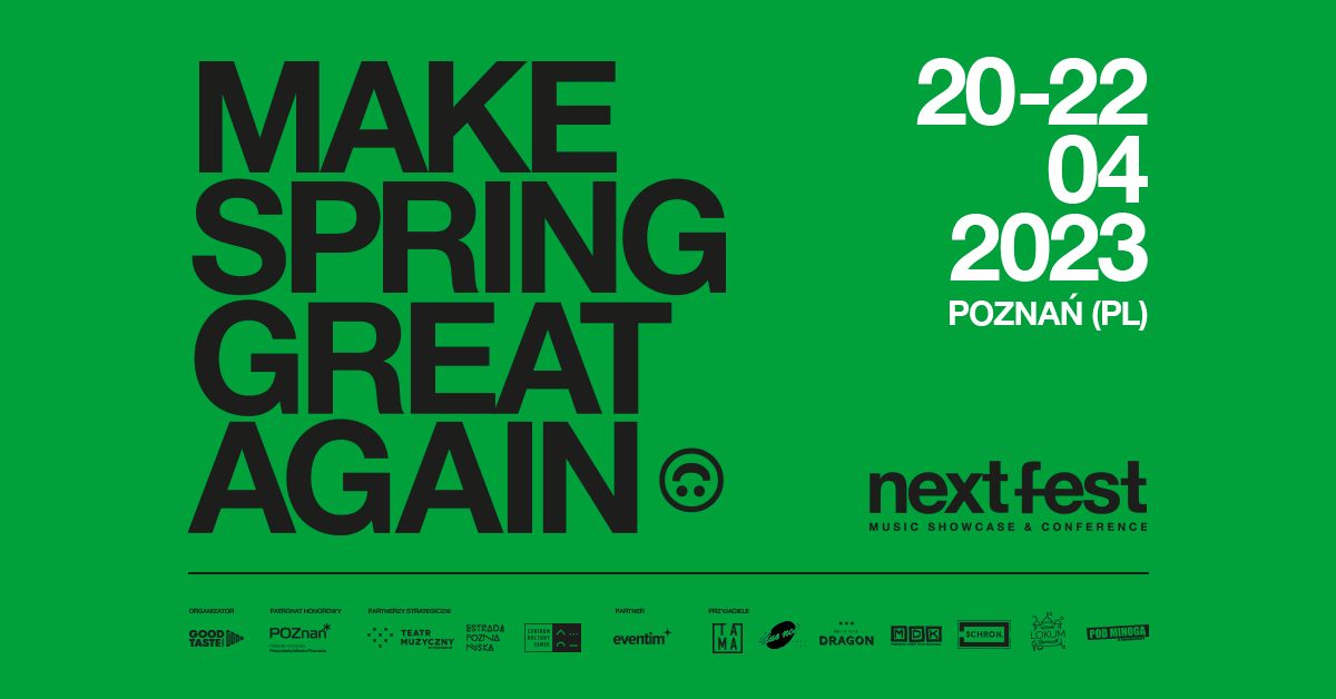 Premierowa edycja NEXT FEST Music Showcase & Conference. Zjawiskowi debiutanci i debiutantki, kilkadziesiąt koncertów, kilkanaście klubów i sceny plenerowe, konferencja dla branży muzycznej, spotkania, warsztaty i dyskusje - to wszystko za niespełna pół roku w Poznaniu. Organizatorzy apelują: Make spring great again!