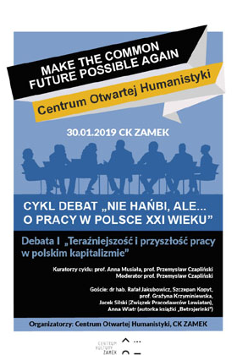 Centrum Humanistyki Otwartej organizuje cykl publicznych dyskusji pod hasłem "Nie hańbi, ale... O pracy w Polsce XXI wieku". Debaty dotyczyć będą prawa (i bezprawia) z pracą związanego, szans i zagrożeń pracy w Polsce, wartości pracy mierzonej przez rynek kapitalistyczny, znaczenia pracy w powojennej historii Polski, miejsca, jakie praca zajmuje w polskiej kulturze, związku pracy z godnością, a także katolickiej wykładni pracy. W cyklicznych spotkaniach udział wezmą pisarze, artyści sztuk wizualnych, autorzy reportaży, a także przedstawiciele i przedstawicielki ekonomii, prawa, socjologii, filozofii, historii kultury, literaturoznawstwa i religioznawstwa.