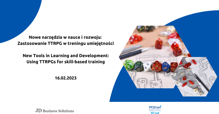 Poznań Biznes Partner oraz JD Business Solutions serdecznie zapraszają na bezpłatny warsztat pt. Nowe narzędzia w nauce i rozwoju - Zastosowanie TTRPG w szkoleniach opartych na umiejętnościach