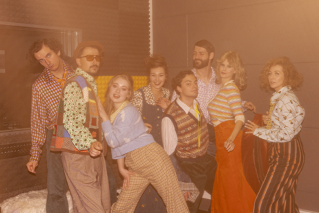 Grupa aktorów i aktorek przebranych w kolorowe stroje w stylu lat 80.