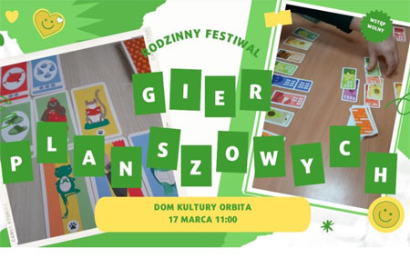 Plansza gry."Rodzinny Festiwal Gier Planszowych. Dom Kultury Orbita, 27 marca 11:00." Pobierz baner (JPEG, 61,29 kB)