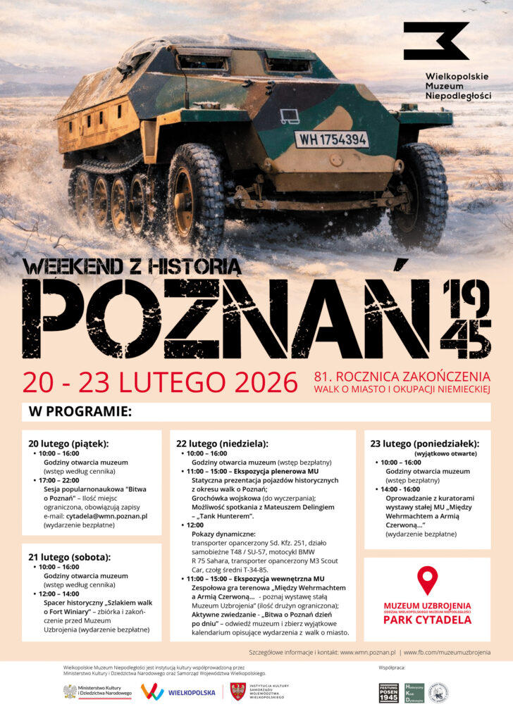 W lutym będziemy obchodzić 81. rocznicę zakończenia walk o Poznań. Zapraszamy Państwa na czterodniowe wydarzenie "Poznań 1945 - Weekend z historią". Przed nami sesja popularno-naukowa, spacer oraz dynamiczne pokazy pojazdów pancernych!