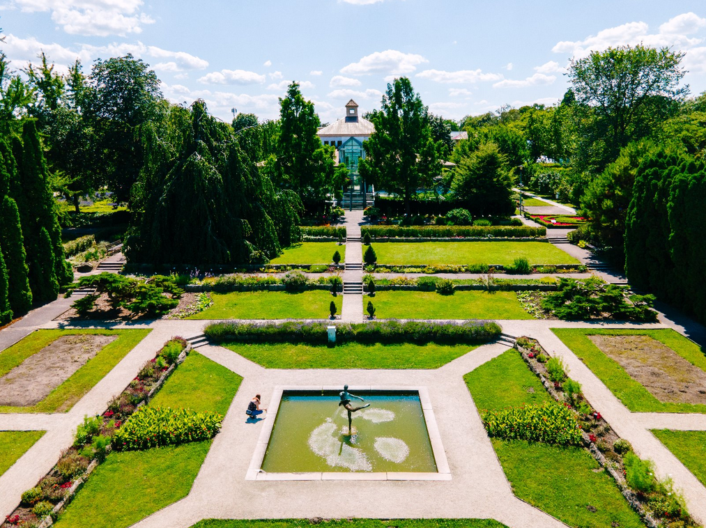 Ogród Botaniczny. Fontanna, rośliny, drzewa i ścieżki spacerowe.