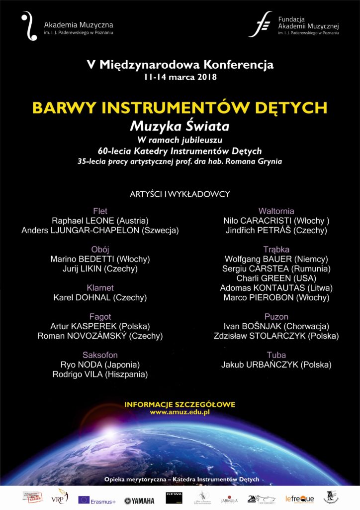 Międzynarodowa konferencja Barwy Instrumentów Dętych jest corocznym podsumowaniem projektu badawczego prowadzonego w Katedrze Instrumentów Dętych. W jubileuszowym dla Katedry roku akademickim - 60 lat działalności - pedagodzy i studenci sięgną do największych dzieł literatury muzycznej przeznaczonej na instrumenty dęte. Podtytuł tegorocznej konferencji to Muzyka Świata. W ramach sesji odbędą się koncerty orkiestry dętej, koncerty kameralne, wykłady, wystawy instrumentów. W konferencji wezmą udział profesorowie z wiodących ośrodków akademickich w Europie.