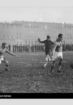 Zdjęcie czarno-białe: zawodnicy grający w piłkę nożną na boisku, na dalszym planie grupa kibiców Pobierz baner (JPEG, 81,87 kB)