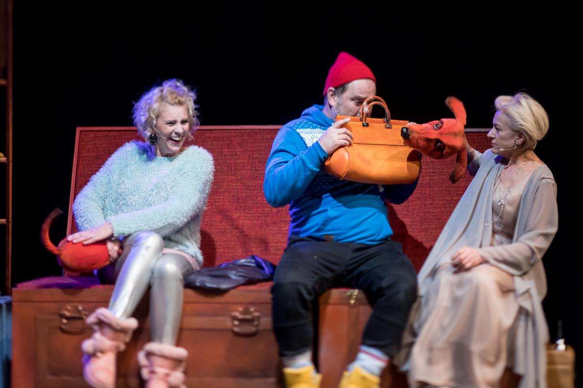 Zdjęcie ze spektaklu: trzy osoby siedzące na ławce. Mężczyzna trzyma przed sobą torebkę, zasłania się przed psem animowanym przez jedną z dwóch aktorek.