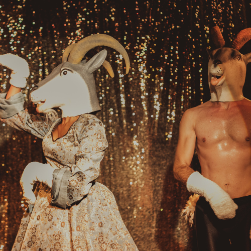 Dwie postacie na scenie: mężczyzna z nagim torsem i kobieta w sukni w srebrno-złotych kolorach. Aktorzy mają założone głowy kozłów. W tle mieniąca się tkanina.