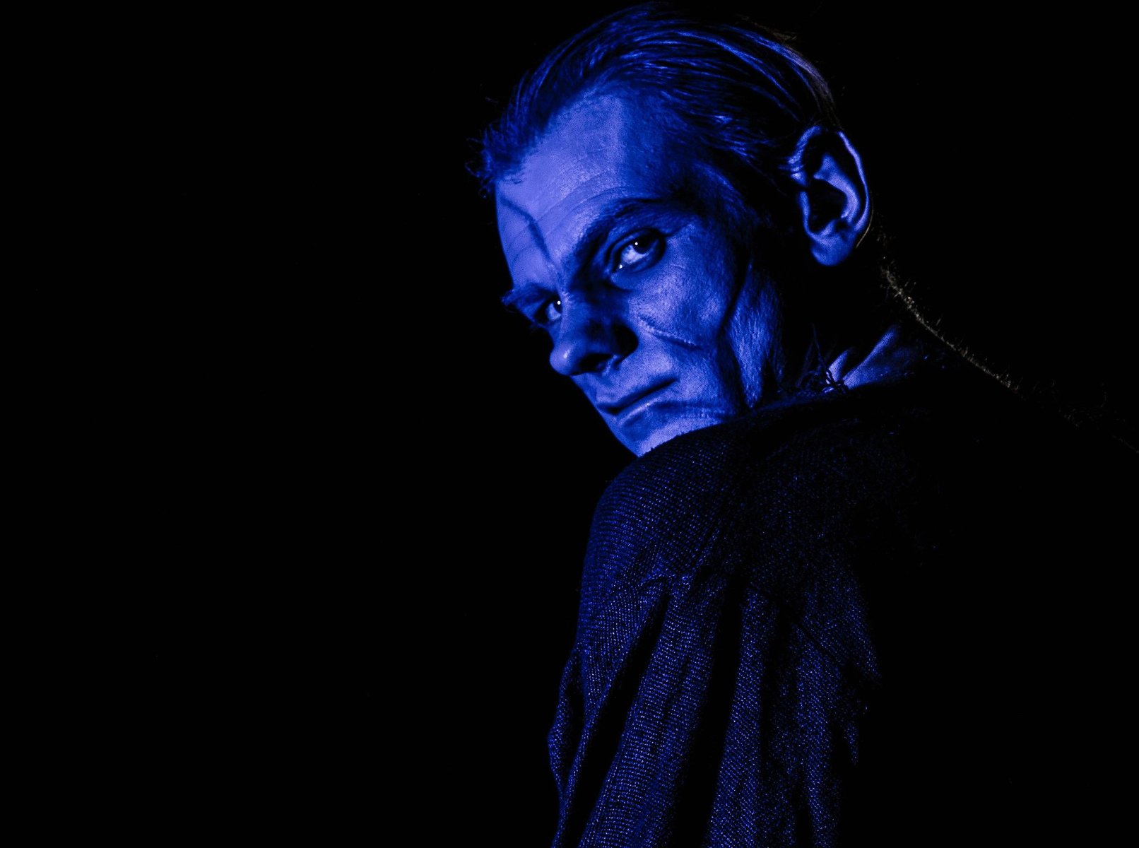 Zdjęcie mężczyzny oglądającego się przez ramię, jego twarz oświetla niebieskie światło.