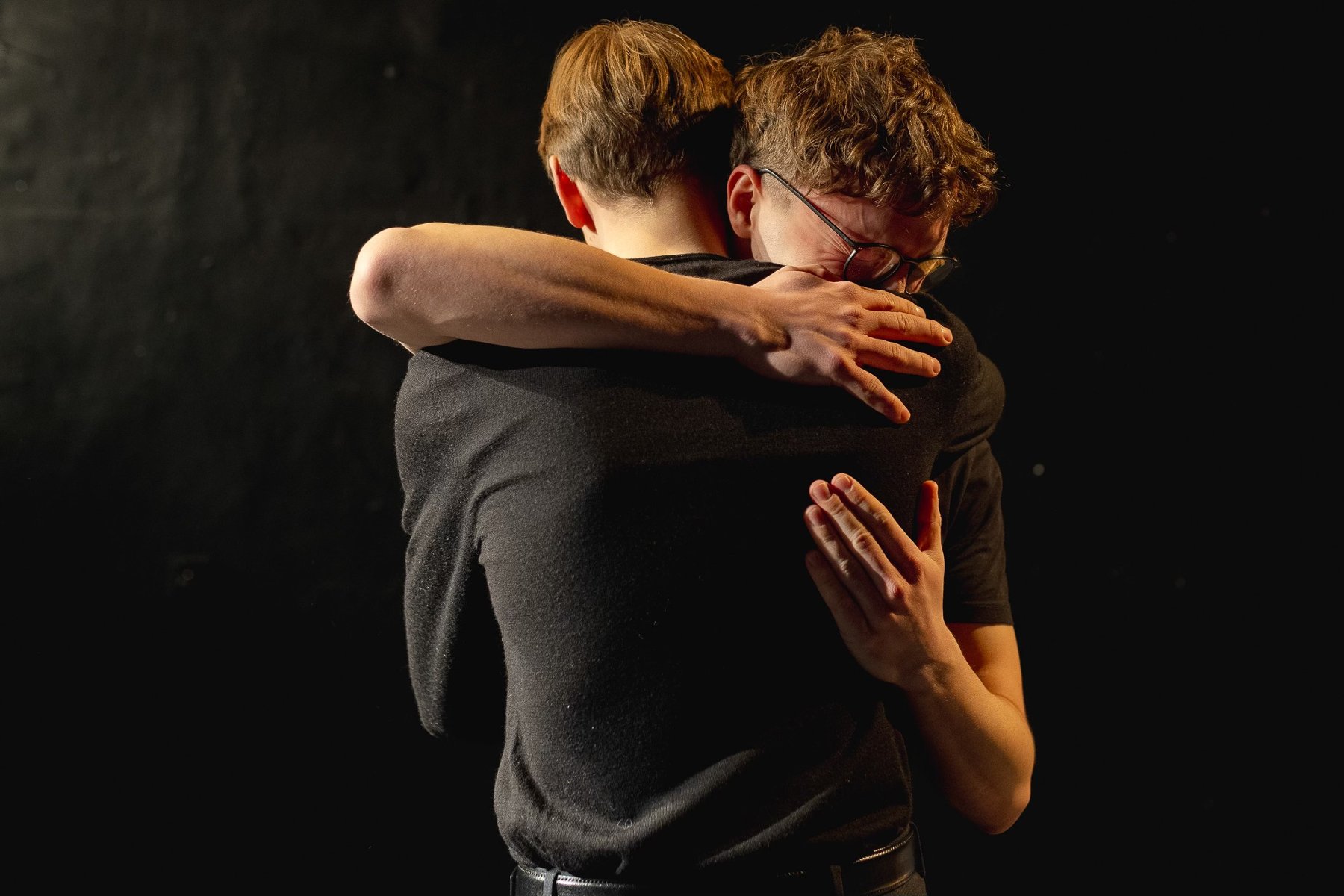 Dwóch mężczyzn przytulających się do siebie, ciemne tło.