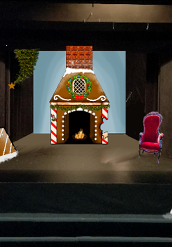 Na środku świątecznie udekorowany kominek, przy nim czerwony fotel. Z lewej strony fragment częściowo ośnieżonego, brązowego dachu.