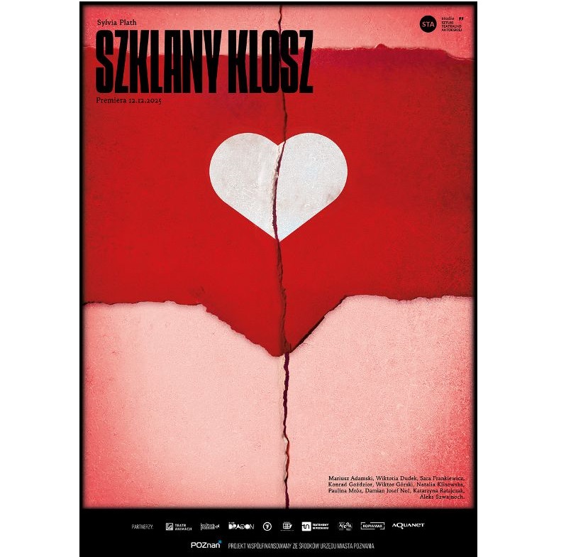Na czerwono-różowym tle niewielkie białe serce. Przez środek całego plakatu widoczne pionowe pęknięcie. Na plakacie również informacje o spektaklu.