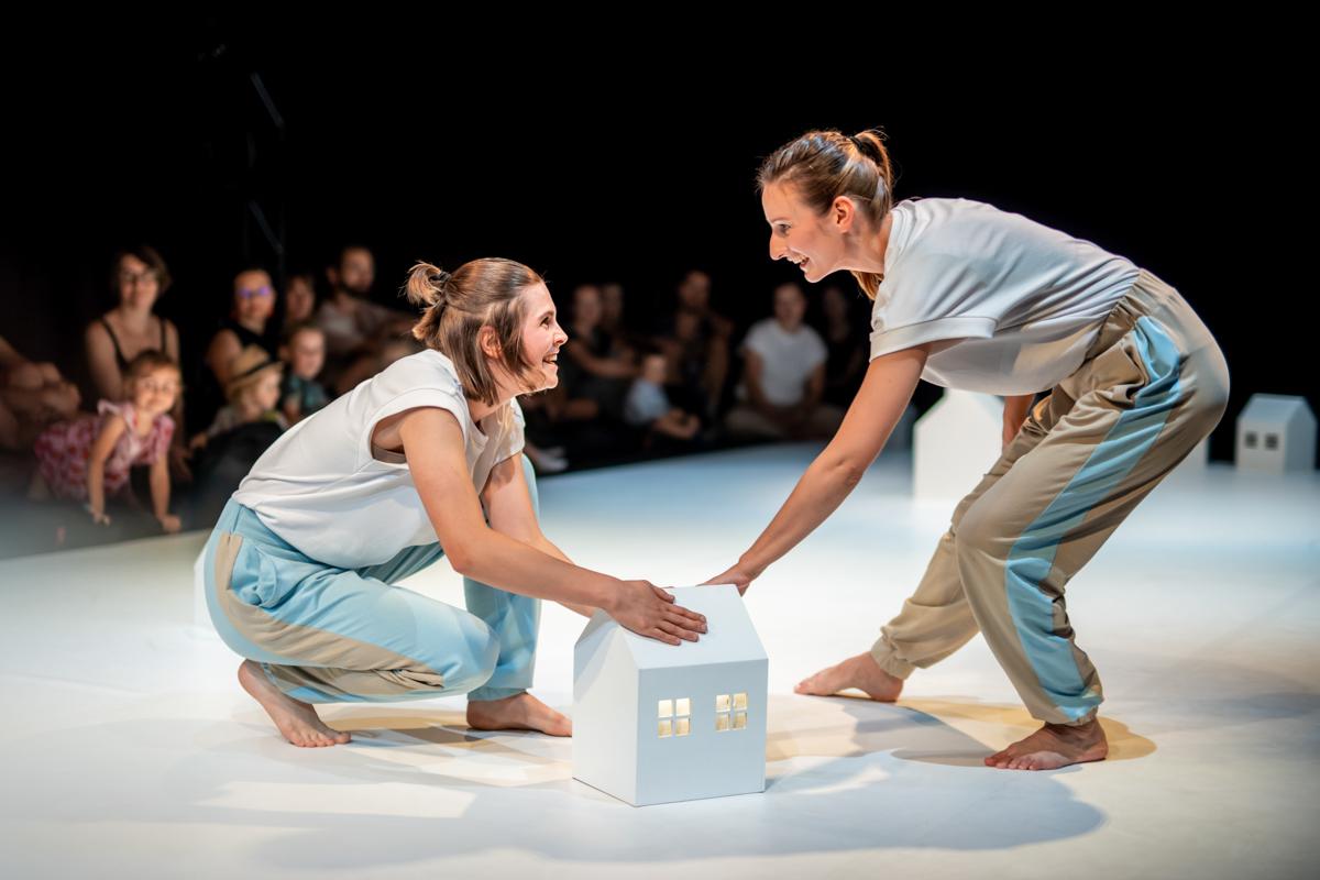 Dwie uśmiechnięte kobiety na scenie na przeciwko siebie, jedna stojąc pochyla się do przodu, druga kuca, obie dotykają białego, kartonowego domku. W tle publicznośc.