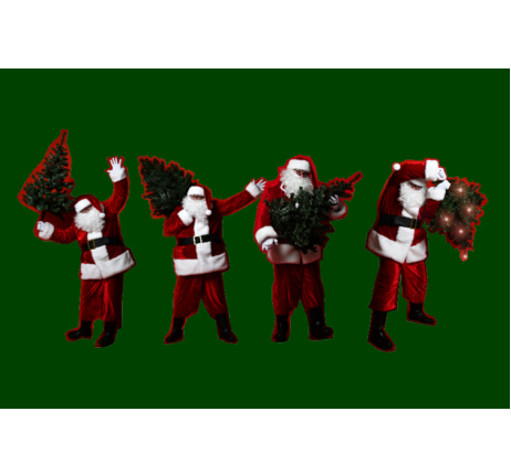 na zielonym tle stoi czterech Świętych Mikołajów ubranych w czerwone stroje z choinkami z rękach
