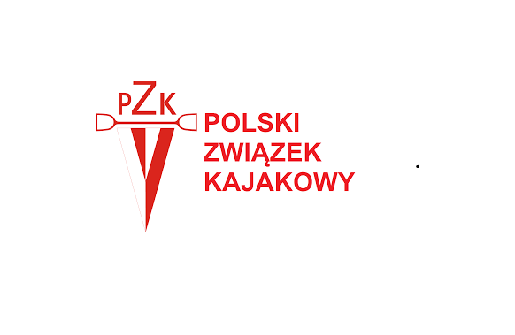 Logotyp Polskiego Związku Kajakowego - po lewej biało-czerwony herb z wiosłem w takim kolorze i skrótem nazwy powyżej. Po prawej czerwona nazwa związku