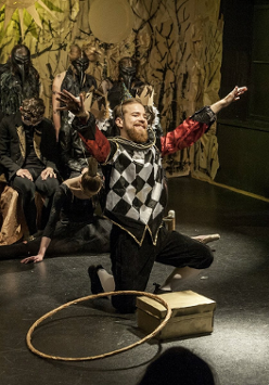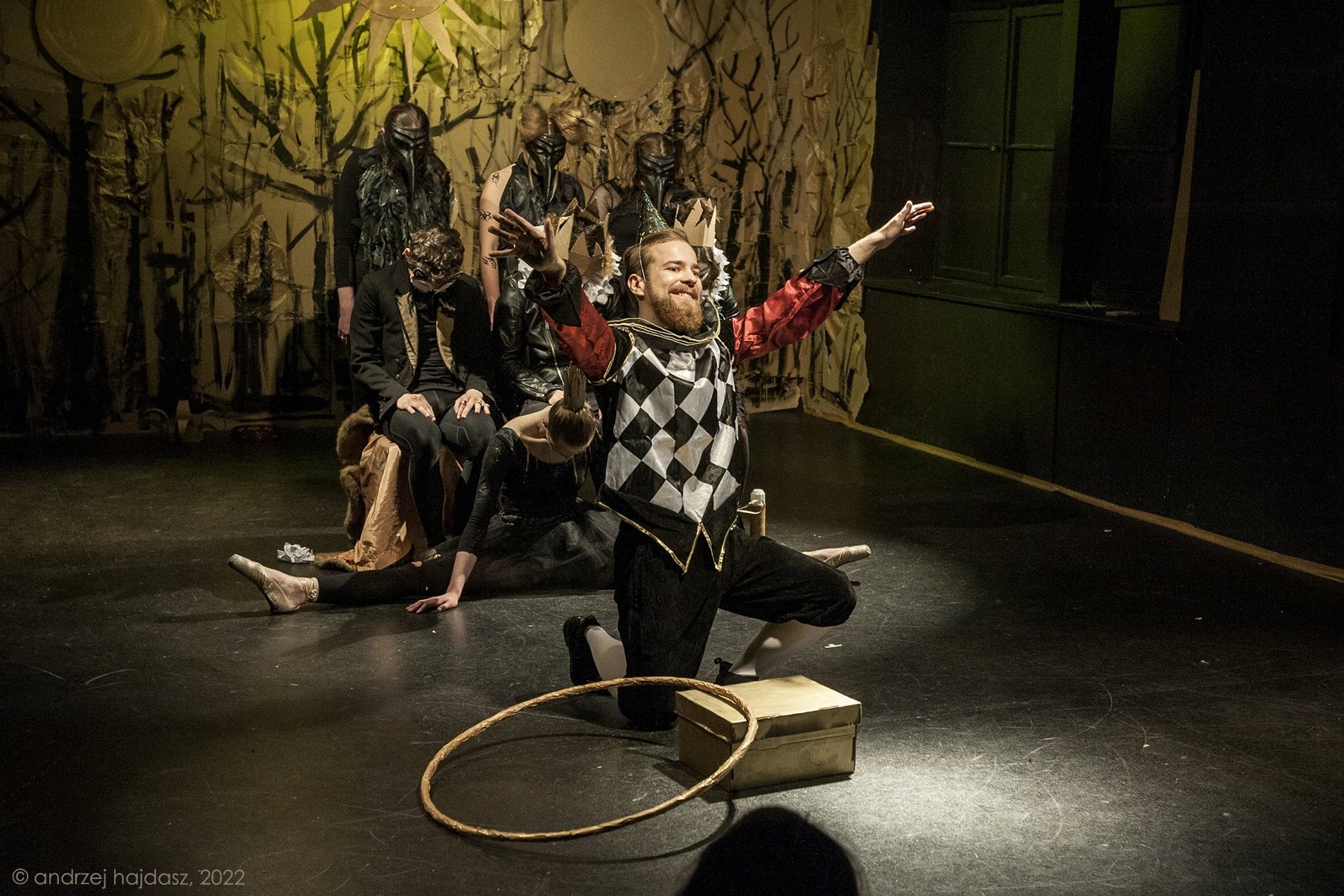 na pierwszym planie mężczyna klęczący na jedno kolano, przed nim stoi pudełko i leży hulahop. Mężczyzna ma kolorowy strój: czarne spodnie do kolan, białe kolanówki, czerwoną koszulę, kamizelkę w biało-czarną szachownicę. W tle kilka postaci ubranych na czarno w różnych pozach. Pobierz baner (JPEG, 488,13 kB)