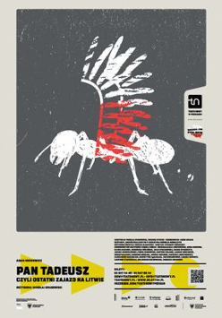 Plakat spektaklu: rysunek mrówki z biało czerwonymi skrzydłami przypominającymi skrzydła husarskie. U dołu plakatu informacje na temat spektaklu.