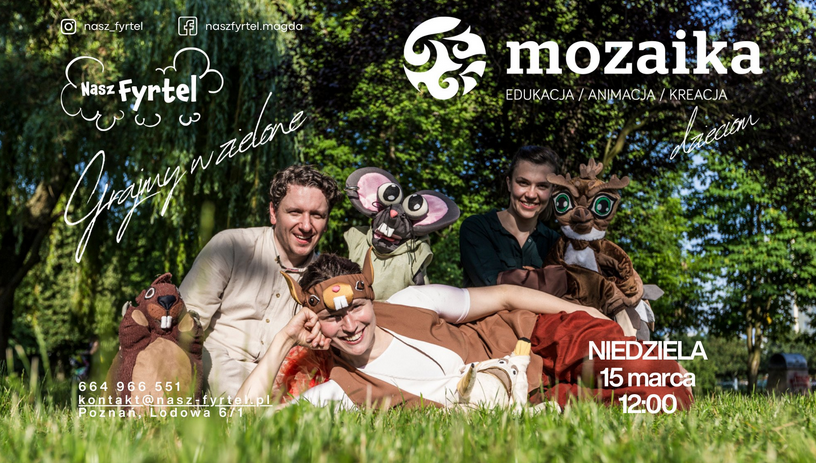 Na zdjęciu widać troje uśmiechniętych dorosłych oraz pacynki zwierząt (między innymi mysz i jelenia) na tle zielonych drzew w parku. Jedna z osób leży na trawie, mając na głowie opaskę z uszami wiewiórki. Wokół umieszczono białe napisy - szczegóły na temat wydarzenia zawarte w treści artykułu.