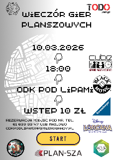 Na górze po lewej stronie znajduje się kość do gry. W tle umieszczono duży, jasnoszary zarys mapy z siatką ulic. Na froncie dłonie pikselowe wskazujące w dół. Po prawej stronie plakatu umieszczono logotypy wydawców gier planszowych. U dołu widnieje żółty przycisk z napisem "Start". Pod nim znajdują się trzy dodatkowe logotypy z ilustracją graczy przy stole, logo Plan-Sza oraz zielono-białe logo ODK "Pod Lipami". Oprócz tego widoczne napisy - szczegóły na temat wydarzenia zawarte w treści artykułu. Pobierz baner (PNG, 227,94 kB)