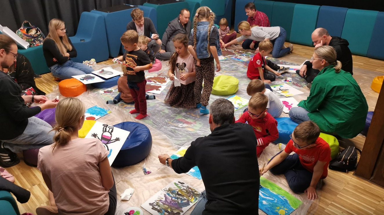 Grupa dzieci i dorosłych siedzi na podłodze w sali warsztatowej, wspólnie malując kolorowe obrazy na kartkach rozłożonych na folii ochronnej. Wokół widać pufy, farby i rysunki w trakcie tworzenia. Pobierz baner (PNG, 1,67 MB)