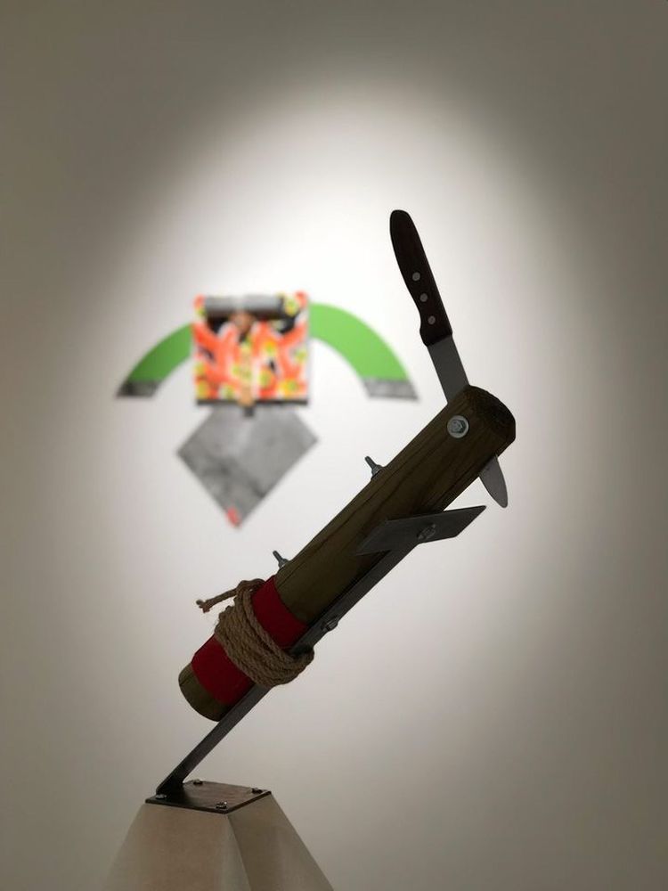 Czasem dochodzi do sytuacji, że podczas analizy dzieła dostrzeżemy je zupełnie inaczej niż chciałby artysta. W jednej kwestii nie zgodzę się z autoanalizą autora. Kruk działając ad hoc stworzył instalację w przestrzeni klatki schodowej Galerii. Do góry nogami powiesił parę swoich dżinsów, pod nimi na szarej tacy leżą przedmioty, które wypadły z kieszeni - monety, świstki itd. Kruk tłumaczył na wernisażu, że jest to tylko na szybko skonstruowany żart artystyczny, nie samodzielna instalacja. W mojej opinii jednak to pełnoprawne dzieło sztuki, związane z poprzednimi instalacjami przestrzennymi Mariusza Kruka, z których jest powszechnie znany. Realizacja zwraca uwagę nie tylko niecodzienną formą, dobrze wpasowaną w przestrzeń, ale też ze względu na swoją nośność symboliczną. Autor chciał nam w ten sposób przedstawić oderwanie od codziennej sieci zależności, takich jak pogoń za pieniędzmi, troska o swoje przedmioty i własną podmiotowość.
