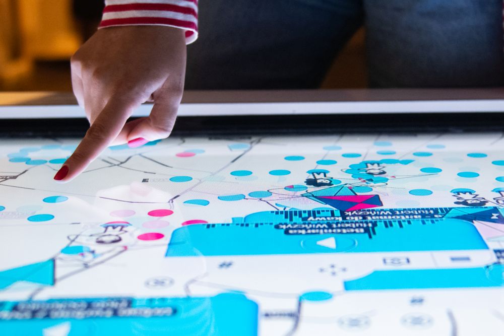 Próbuję więc, ale choć instrukcja każe mi złapać "chmurkę", to nic mi nie wychodzi, chmurka znika, zostaję z białą planszą z siatką ulic. W lewym górnym rogu zauważam menu, więc próbuję z niego skorzystać. I choć udaje mi się otworzyć plany różnych dzielnic, mam kłopot z odtworzeniem na Fonomapie jakiegokolwiek dźwięku. Kreślę esy-floresy na wyświetlaczu dotykowym, muskam go i iskam - na próżno. Dostrzegam w pewnym momencie martwą muchę leżącą na brzegu Fonomapy i uznaję ją za znak, by dać sobie już spokój z próbami "ożywienia" tej instalacji. Z drugiej strony pozostaje zauważyć przy okazji, że sama czarno-biała grafika map pozbawionych jakichkolwiek oznaczeń, słów, znaków (poza nazwami dzielnic), jest chyba mało interesująca dla młodych odbiorców - a na pewno mało czytelna i nudna również i dla dorosłych.
