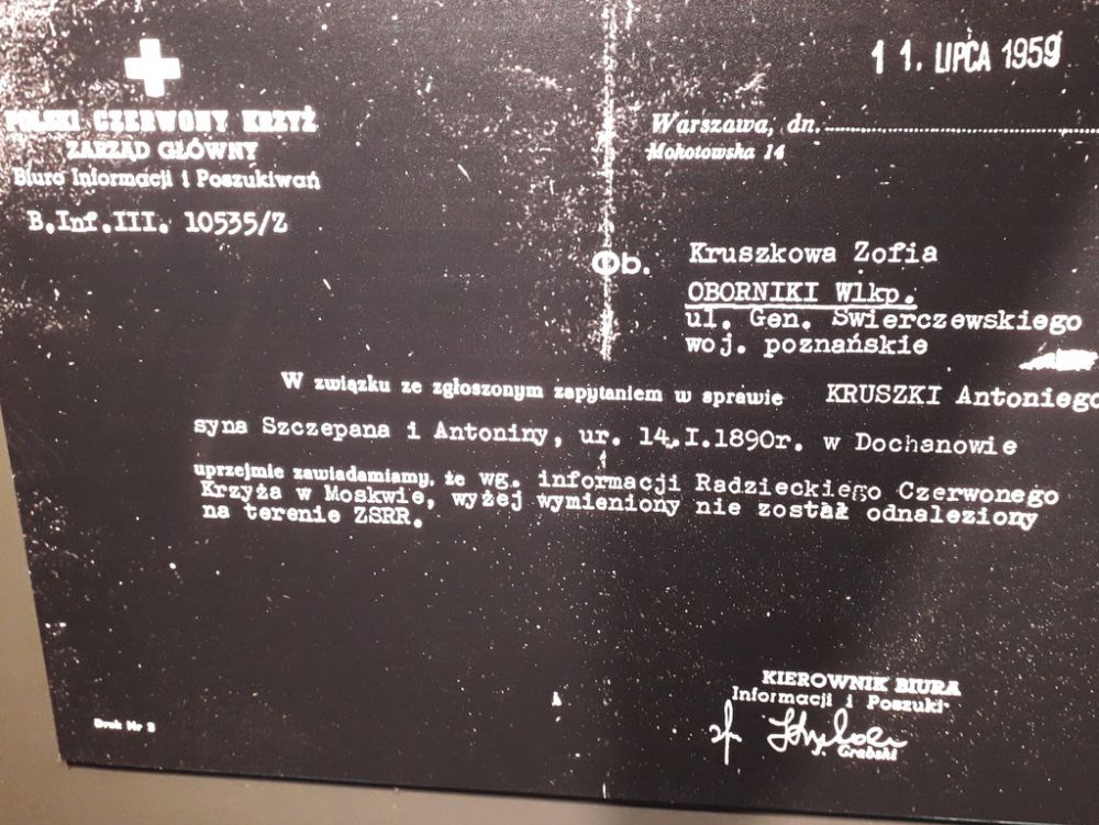 Przejmującym świadectwem tych czasów są listy wysyłane przez rodziny do różnych instytucji zajmujących się poszukiwaniem osób zaginionych w zawierusze wojennej. Rodziny katyńskie jeszcze przez wiele lat po 1945 roku pisały m.in. do Czerwonego Krzyża z prośbą o poszukiwanie i ustalenie losów mężów i ojców zaginionych w czasie wojny. Instytucje te pisały w odpowiedzi "nic nie ustalono", "zaginionego nie odnaleziono", "brak danych o osobie", chociaż na zachodzie dokładnie wiedziano, co się z nimi stało. Na wystawie zobaczymy przede wszystkim listy wysyłane przez rodziny katyńskie z Poznania (lub w czasie okupacji - Posen).