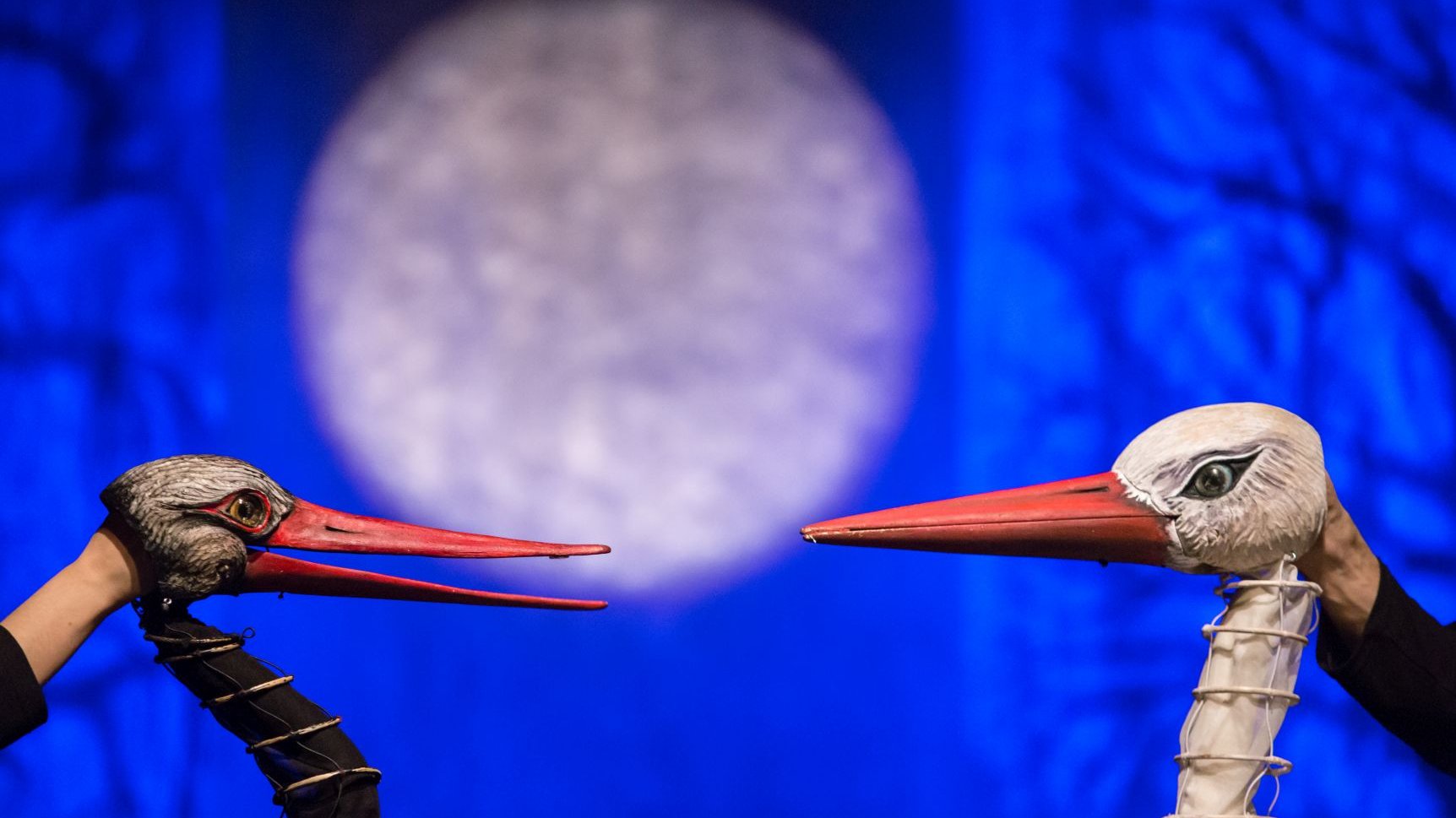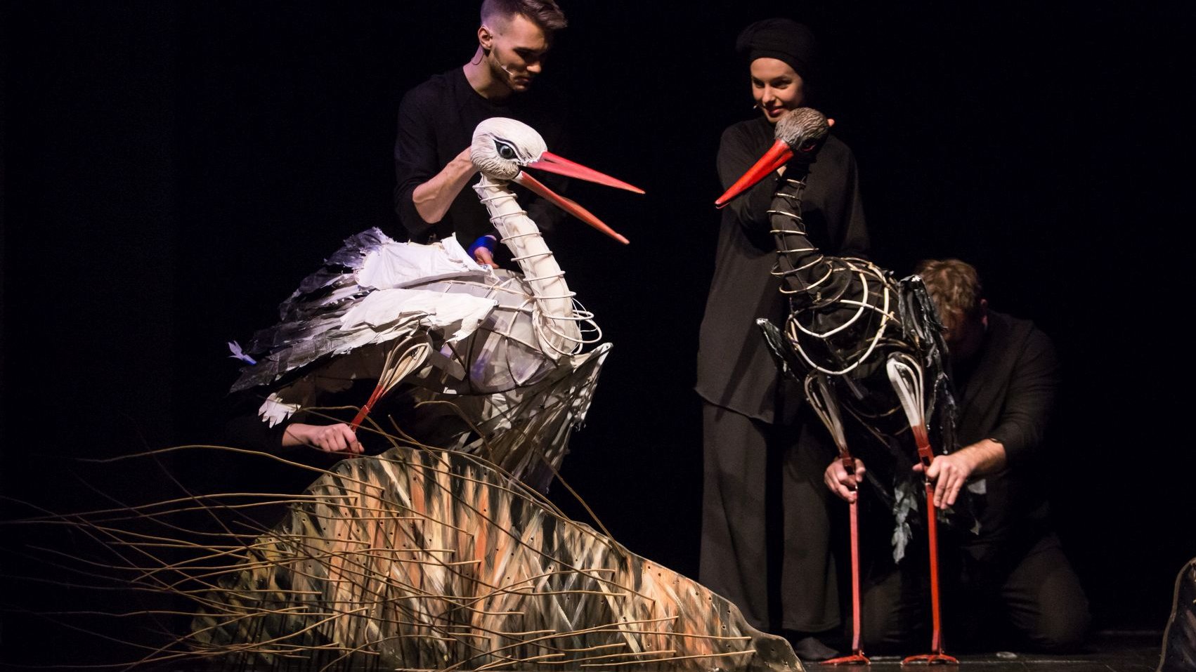 Publiczność z ciekawością podziwia, jak lalki parawanowe współgrają z cieniowymi. Śmieje się, gdy animatorzy bawią się formą w scenie z filozofującym marabutem, którego szyja celowo błądzi, a nogi gubią tułów. Jednak największy entuzjazm wzbudzają realistyczne, mroczne sekwencje, kiedy ptaki rozpościerają skrzydła i toczą między sobą bitwy lub zrywają się do lotu. Przestrzeń sceny wydaje się wtedy zbyt ciasna. Miejscem gry staje się wówczas widownia, a nawet foyer.