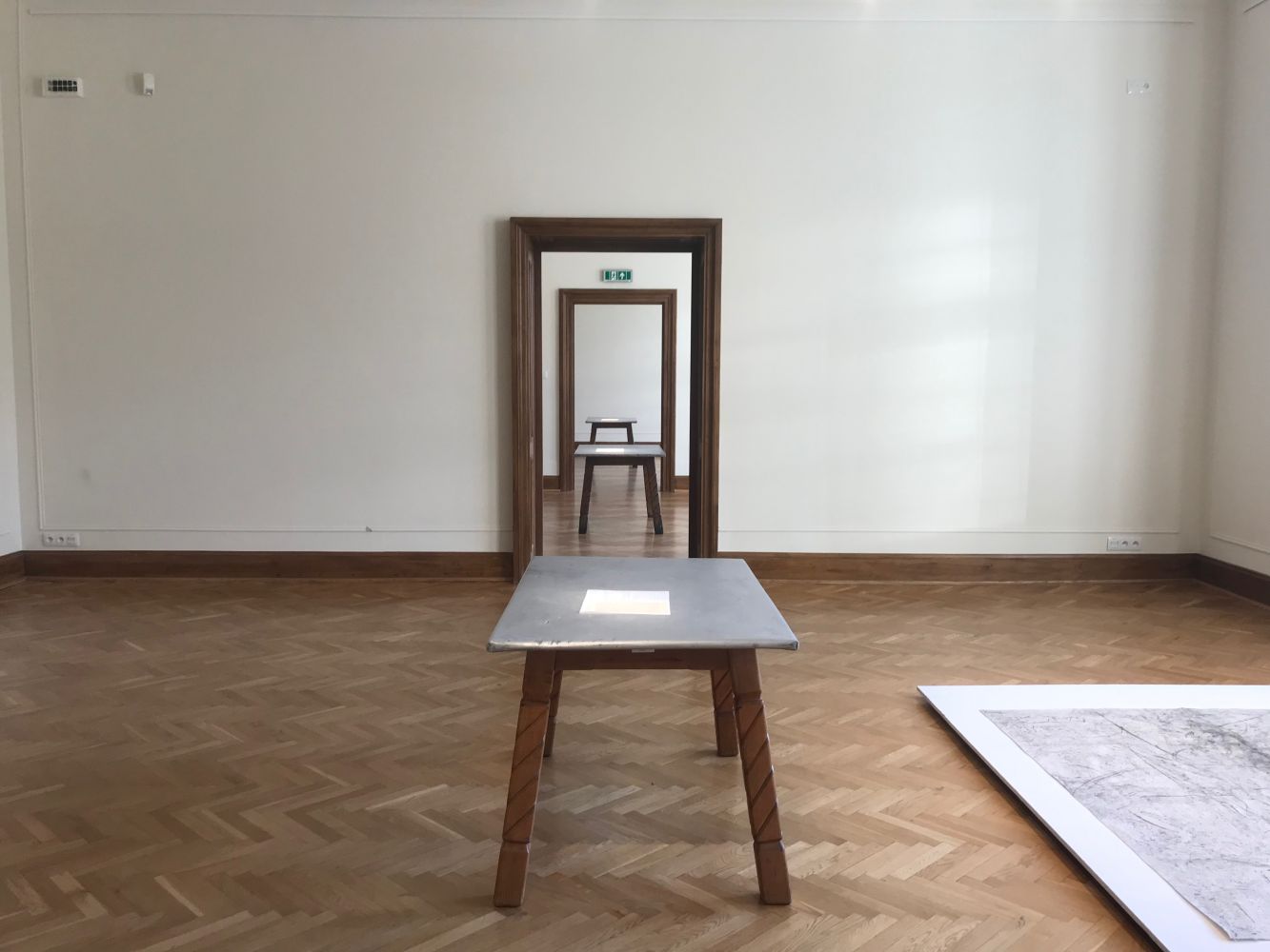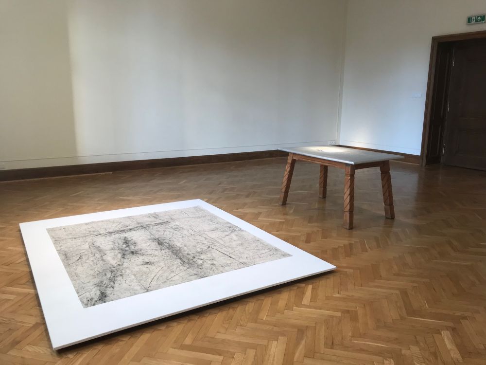 Po wizycie w sali numer 60 w mojej głowie działo się dużo, niektóre fotografie i słowa zapadły mi w pamięć. Po tym nadmiarze bodźców wkroczyłam do Laboratorium, w którym umieszczono słynne frotaże Lichtig, a konkretniej serię prac Blank Spots z 2017 roku. To bardziej ascetyczna część wystawy - w każdym z trzech pomieszczeń Laboratorium umieszczono jeden frotaż (każdy z nich był "portretem" konkretnego miejsca pamięci) w towarzystwie arkusza A4 na stole z losowo tłumaczonymi zdaniami - to część pracy Můj útěk, której kontynuację znajdujemy na korytarzu. W tle słyszymy nagranie głosowe artystki, które koresponduje z arkuszami Blank Spot Notes umieszczonymi w każdej przestrzeni. Choć idea stojąca za pracami z cyklu Blank Spots jest silnie powiązana z historią, to trudno mi znaleźć nić zainteresowania łączącą każdą z prezentowanych tam prac. Dostrzegam przede wszystkim pustkę, ale może właśnie o to chodzi?