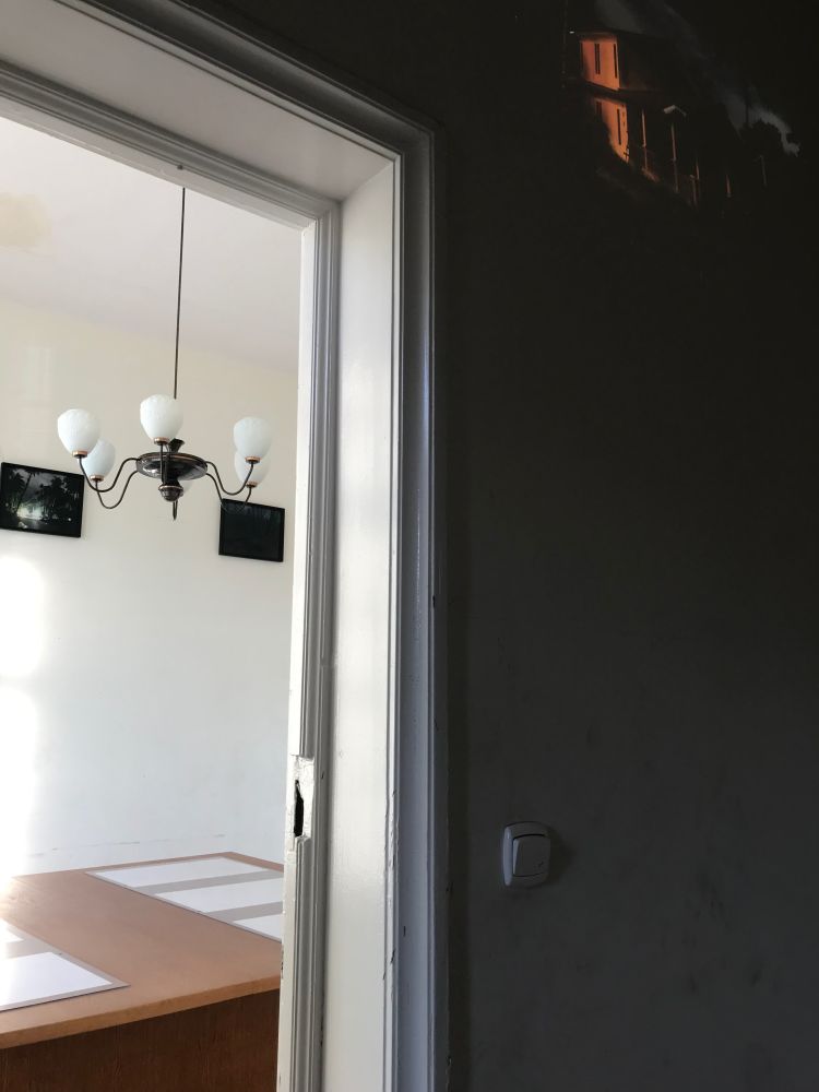 Zacznijmy zatem od niepozornej sali numer 60, w której zaprezentowano projekt Ghosttrap rozpoczęty przez artystkę w 2007 roku. W zależności od miejsca ekspozycji, Ghosttrap może przyjmować różne formy. W tym konkretnym przypadku wszystkie trzy części pracy umieszczono we wspólnej przestrzeni. Na stole wypełniającym niemal całą przestrzeń umieszczono serię odbitek sitodrukowych na papierze - znajdujące się na nich teksty można przeczytać tylko w ciemności. Dalej, na ścianach, powieszono 9 fotografii, niektóre z nich korespondują z płynącym zza ściany nagraniem. W małym pomieszczeniu roboczym, nad zniszczonym zlewem i kuchennymi szafkami, umieszczono projektor emitujący krótkie wideo. W tle słyszymy głos artystki, która słucha nagranych przez siebie wywiadów i powtarza słowa wypowiadane przez swoje rozmówczynie i rozmówców. Poznałam ten projekt przygotowując zapowiedź wystawy, ale po wizycie w Zamku zyskał dla mnie zupełnie nowy wymiar.
