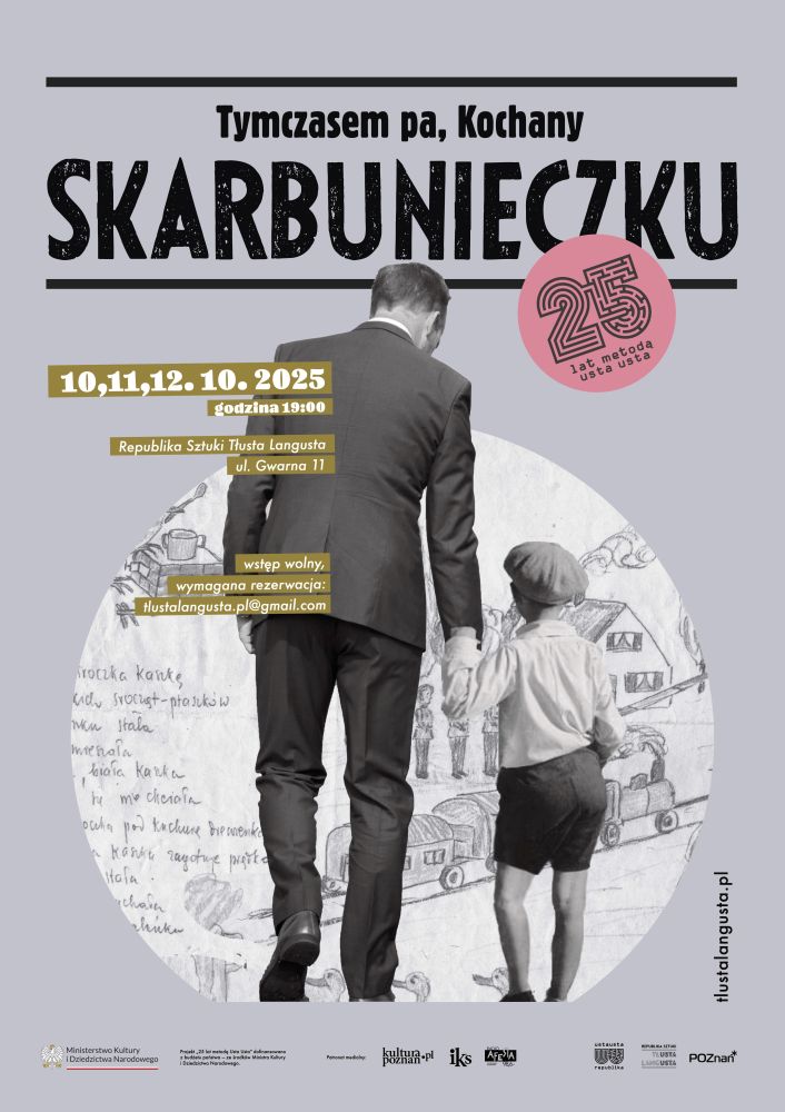 Finałem jubileuszu jest pokaz spektaklu "Tymczasem pa, Kochany Skarbunieczku", który odbędzie się w dniach 10, 11 i 12 października w Republice Sztuki Tłusta Langusta w Poznaniu. Wydarzeniu towarzyszyć będą warsztaty teatru dokumentalnego, prowadzone przez Ewę Kaczmarek - aktorkę, scenarzystkę i współtwórczynię artystycznej metody teatru Usta Usta Republika.