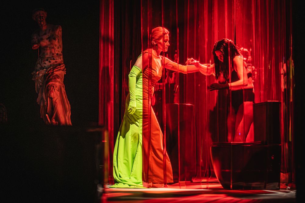 Gdyby poznański "Pigmalion" poprzestał na połączeniu tych dwóch estetyk - dystopii oraz satyry - byłby przedstawieniem na wskroś udanym i mocnym. Rzecz w tym, że twórcy niepotrzebnie rozwadniają te wątki konwencjonalnym teatrem psychologicznym i scenami, w których ich zainteresowanie przekierowuje się na kryzys związku Katarzyny i Wojciecha oraz na uczucie, jakie zaczyna on żywić w stosunku do Elizawiety. Sztampowe sceny kłótni małżeńskich ze sztywnymi dialogami nie są w stanie wybrzmieć, gdyż wcześniej wprowadzone rejestry skutecznie osłabiają ich siłę. Dramat rodzinny w tym przypadku jest wyjątkowo nieinteresujący. Co więcej, w tle niknie gdzieś wewnętrzna przemiana Kaliny, która pod wpływem kontaktu z imigrantką porzuca swe ksenofobiczne uprzedzenia, za to nadal celnie punktuje fałszywe i podszyte lękiem postawy rodziców. Jeszcze bardziej zbędne wydały mi się, nieliczne na szczęście, sceny, w których twórcy w nostalgicznej poetyce eksplorują modny ostatnio temat doświadczeń milenialsów oraz cudownych lat 90. Ten sentymentalny autobiografizm pasuje do wcześniejszych fragmentów jak pięść do nosa, niepotrzebnie rozprasza uwagę widzów i odrywa od tematów naprawdę istotnych. Doświadczenia generacyjne są oczywiście ważne i za ich pomocą twórcy starają się ukazać, że obcość Elizawiety jest pozorna. Wiemy to jednak i bez tego.