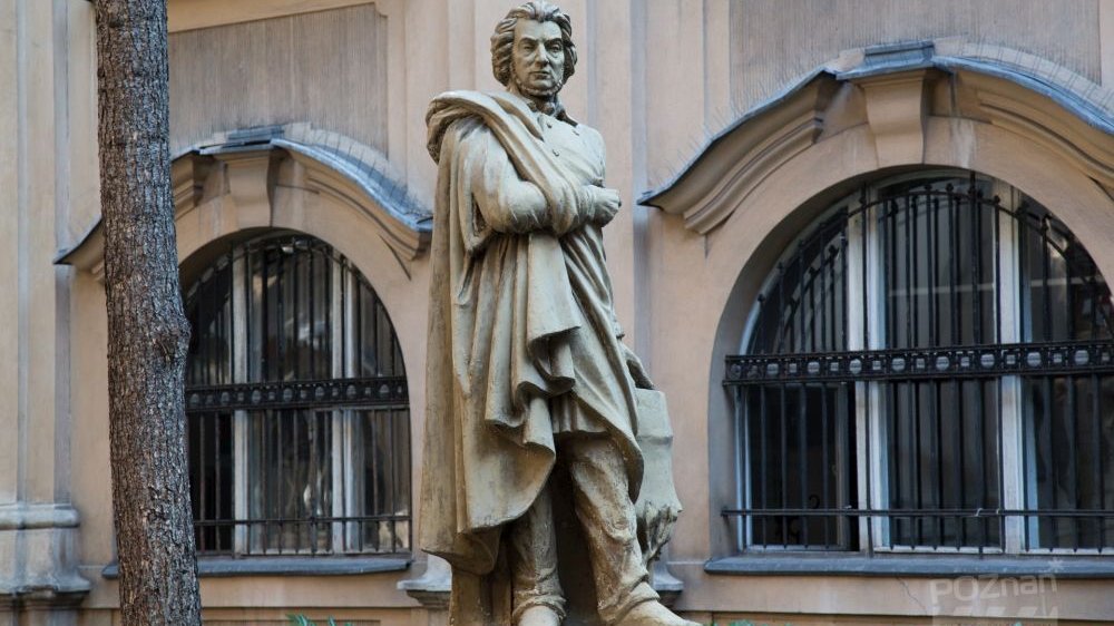 Budynek z piaskowca, a przed nim pomnik przedstawiający mężczyznę w dlugiej szacie. - grafika artykułu